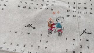 クロスステッチ、刺繍 セリアのファブリックカレンダーにクロスステッチ 2 セリアのファブリックカレンダーにクロスステッチしています。12月の辺りにステッチしたくつ下はバックステッチのないデザインだったので前回のうさぎとバランスが取れてないような気がします。自転車に乗ったクマさんはバックステッチ多めですですが、デザインのバランスはどうでしょう? 2025.10.04 クロスステッチ、刺繍